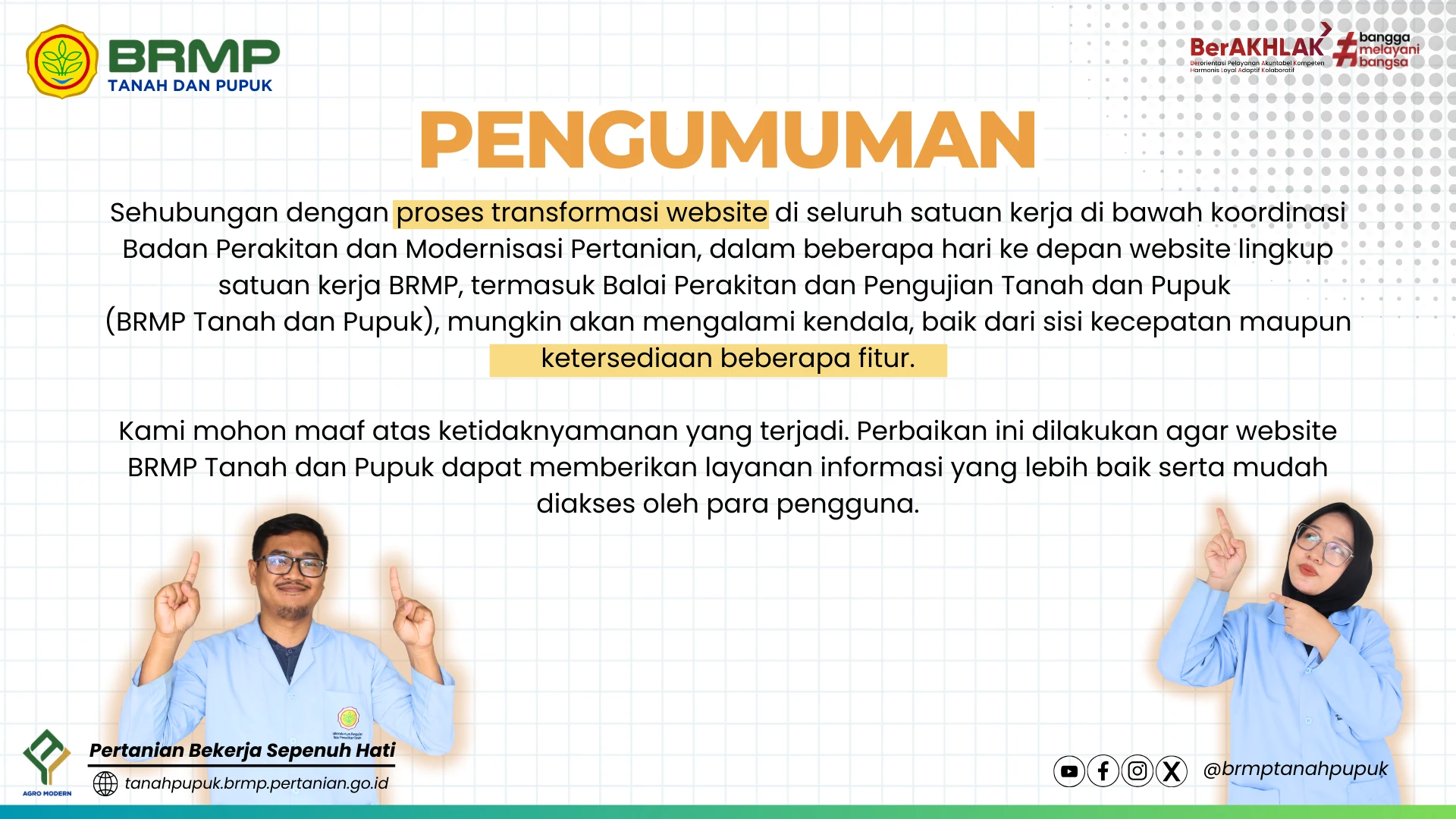 Transformasi website Badan Perakitan dan Modernisasi Pertanian, termasuk BRMP Tanah dan Pupuk akan mengalami kendala.