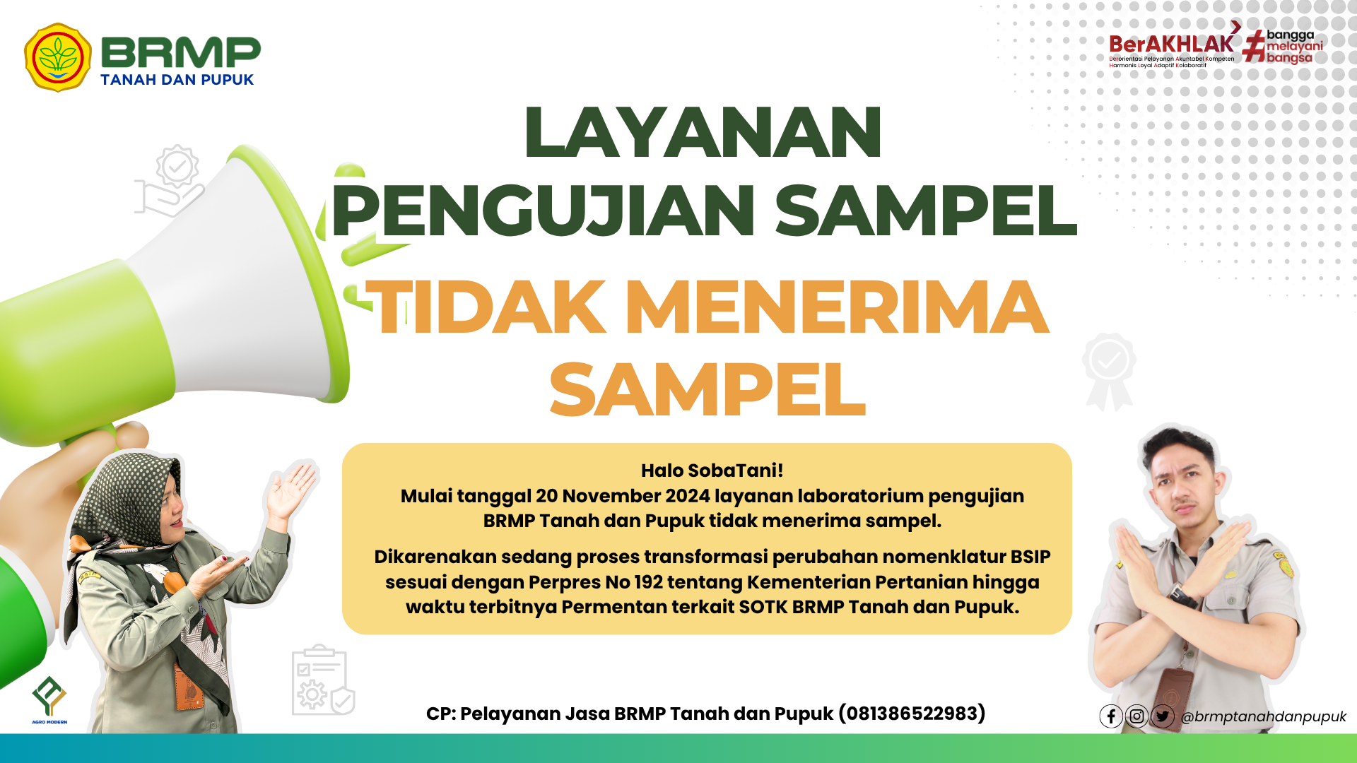 Mulai tanggal 8 September 2025 layanan laboratorium pengujian BRMP Tanah dan Pupuk sudah dibuka kembali.