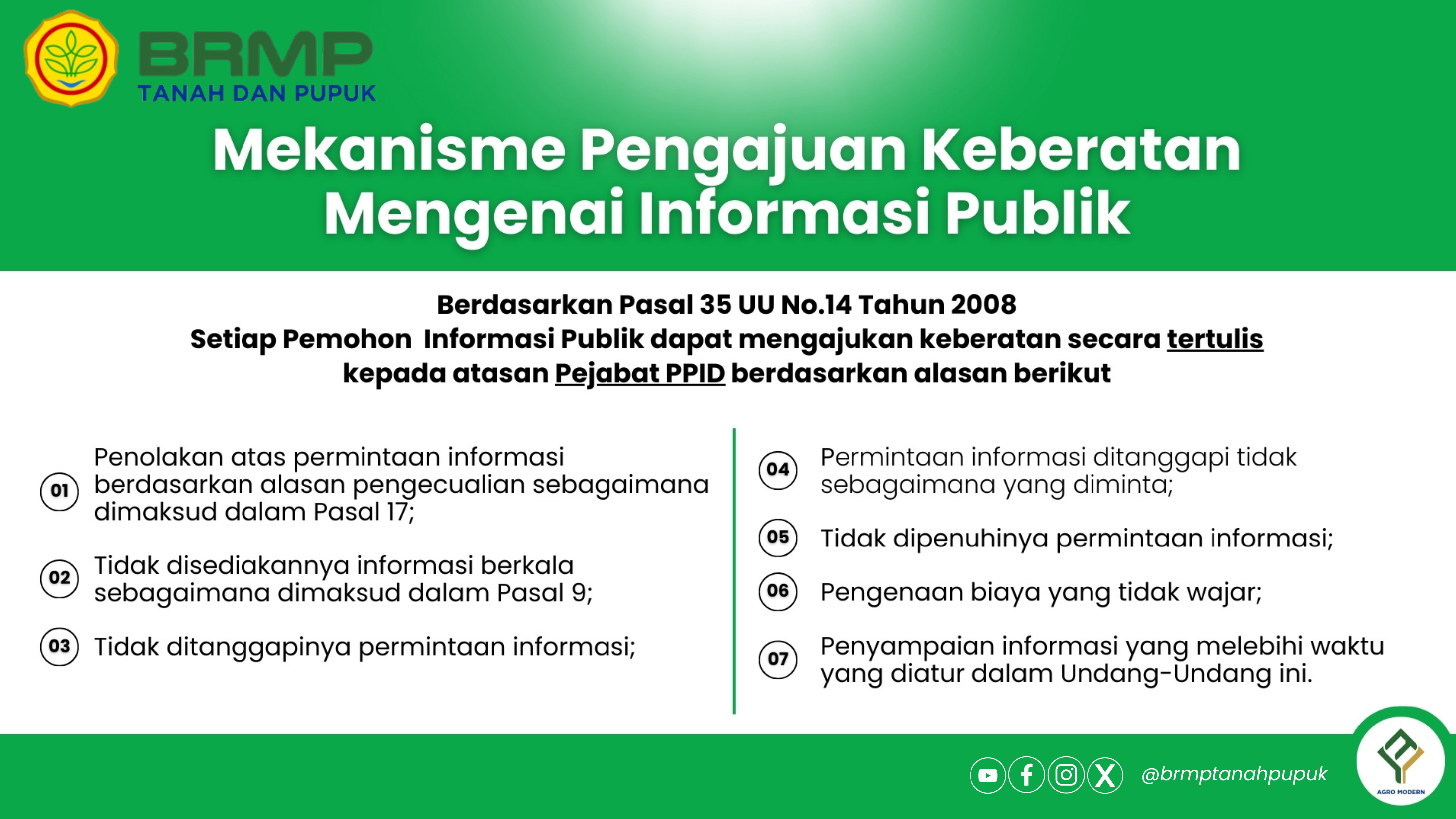 Setiap pemohon informasi publik dapat mengajukan keberatan secara tertulis kepada atasan Pejabat Pengelola Informasi dan Dokumentasi dengan alasan sebagaimana ditetapkan dalam pasal 35 Undang-Undang Nomor 14 Tahun 2008. Keberatan diajukan oleh Pemohon Informasi Publik dalam jangka waktu paling lambat 30 (tiga puluh) hari kerja setelah yang bersangkutan menemukan alasan keberatan.
